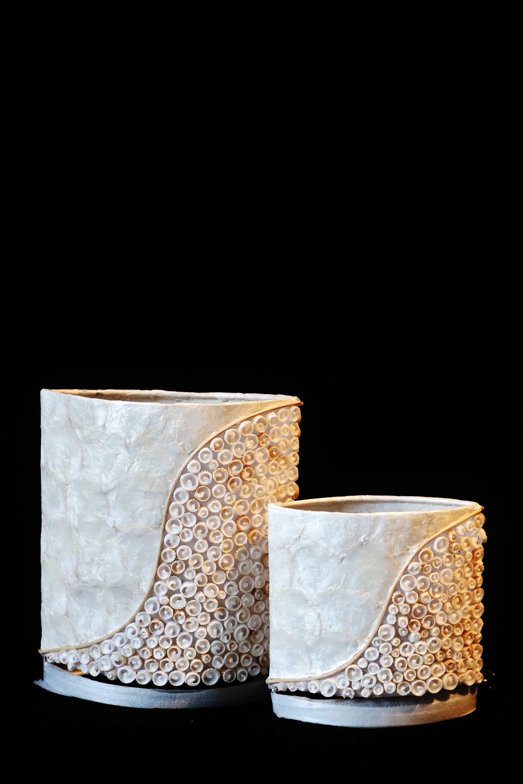 Table lamps in oval shape, made of mother-of-pearl capiz shells and dark carved shells